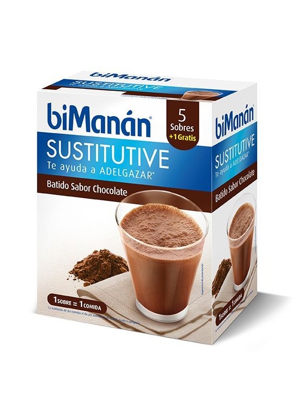 BIMANÁN BATIDO CHOCOLATE 5 SOBRES SUSTITUYE UNA COMIDA* PARA EL CONTROL DE PESO, CON AZÚCARES Y EDULCORANTES. CUENTA CON 12 VITAMINAS Y MINERALES. ES RICA EN CALCIO Y FÓSFORO.*LOS PRODUCTOS SUSTITUTIVOS DE UNA COMIDA DEBEN CONSUMIRSE SIEMPRE DENTRO DEL MARCO DE UNA DIETA VARIADA Y EQUILIBRADA.